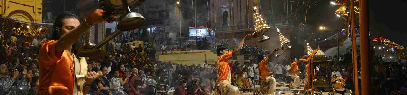 people gather at the banks of the river Ganges to participate in the aarti (hymn). The evening aarti offers one of the most spectacular